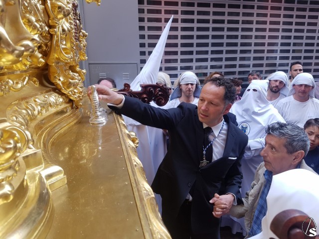 (En las imágenes, se aprecia a Miguel Loreto junto a Javier Prieto, tocando el martillo del paso del Señor de la Resurrección la pasada Semana Santa).