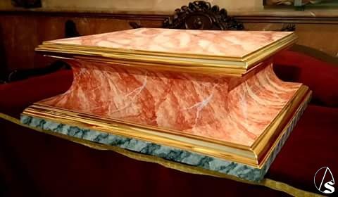 Arte Sacro. En días pasados el taller de carpintería artesanal religiosa de Daniel Sánchez Vázquez de Isla Cristina, entregó a la hermandad de las Siete Palabras, una vez restaurada, la peana donde descansa la imagen del Sagrado Corazón de Jesús.