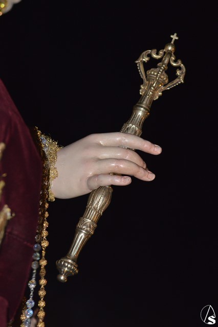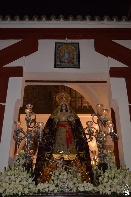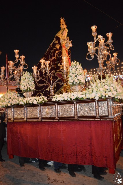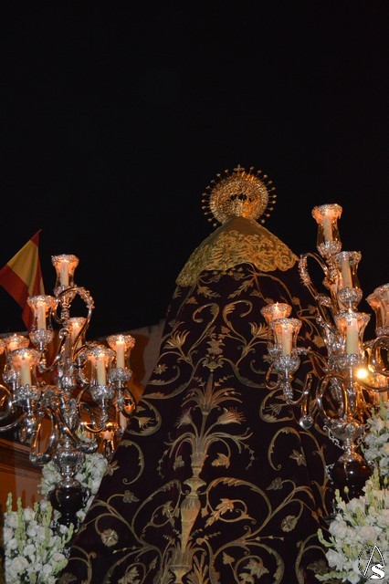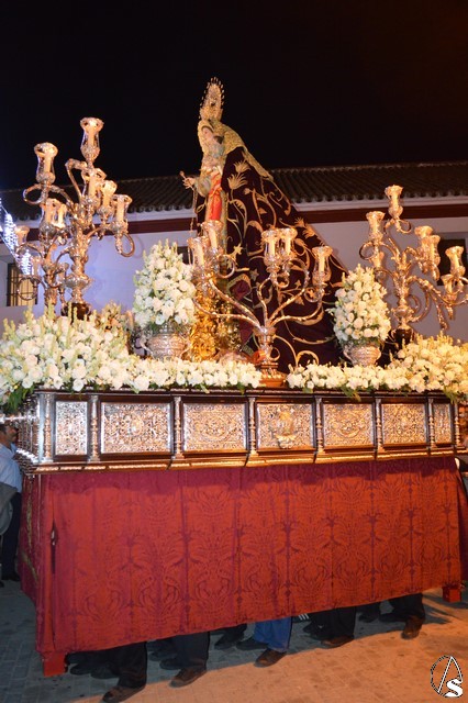 Nuestra Señora del Rosario procesiona sobre paso con respiraderos que combina la madera y la plata, y alumbrada por altos candelabros de guardabrisas, la imagen mariana es portada sobre peana de madera tallada y dorada. Para su salida procesional luce saya blanca bordada y manto de terciopelo rojo bordado por Juan Manuel Rodríguez Ojeda en 1902. Sobre sus sienes corona de oro. En su mano izquierda sostiene al Santísimo Niño que lució túnica blanca. A sus plantas dos angelitos sostienen el Bastón de Mando de la Villa de Brenes.
