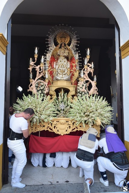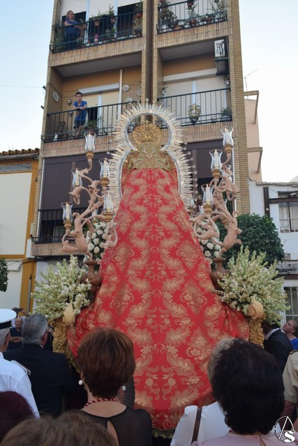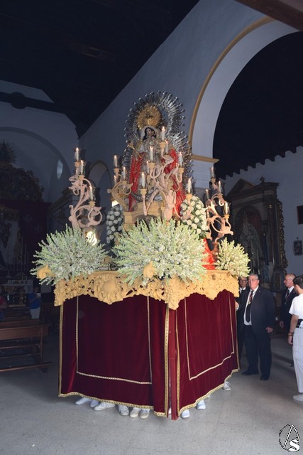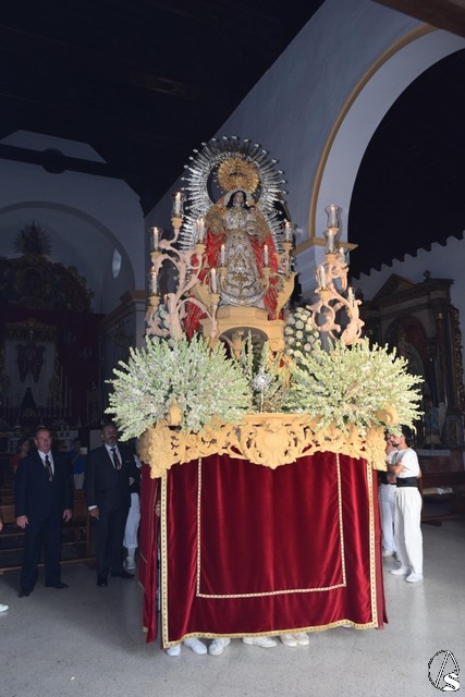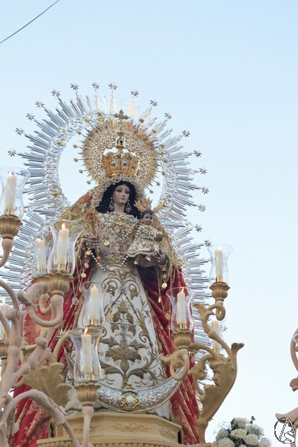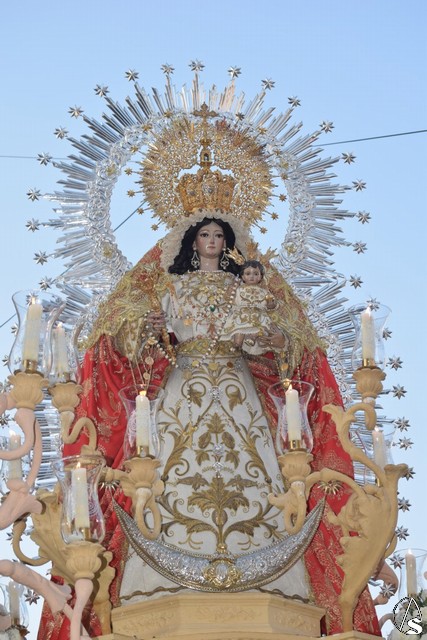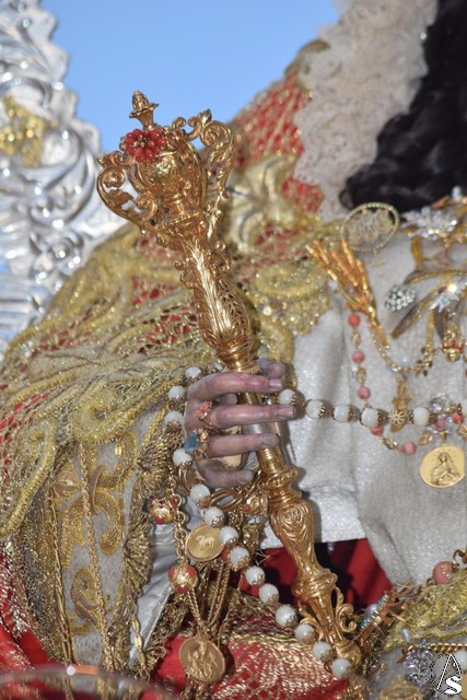 En su paso, aún en proceso de recuperación y con saya blanca y manto rojo de la imagen de la Virgen del Rosario fue acompañada en todo momento por sus fieles, los pelones, como así se les llama durante las horas que duró la procesión.