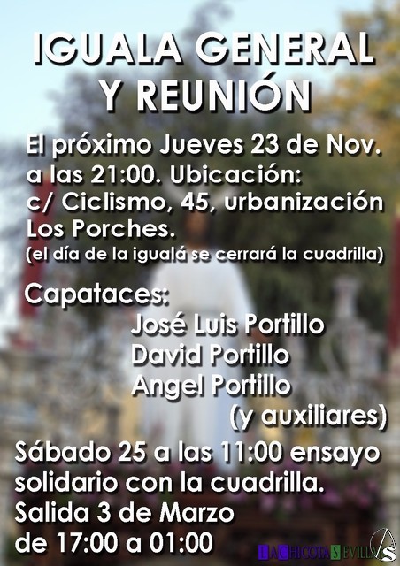 Arte Sacro. Igualá y reunión de costaleros del paso de Nuestro Padre Jesús del Consuelo (Sevilla Este) a las 17 horas del jueves 23 de noviembre a las 21 horas.