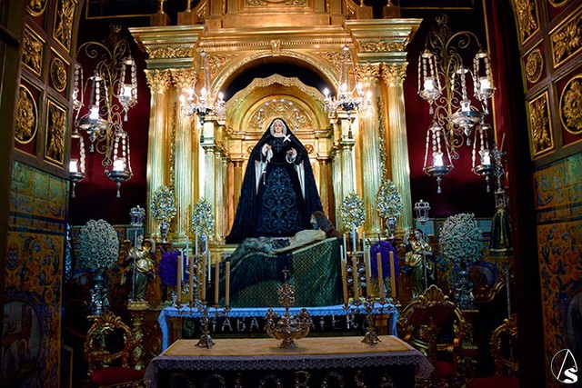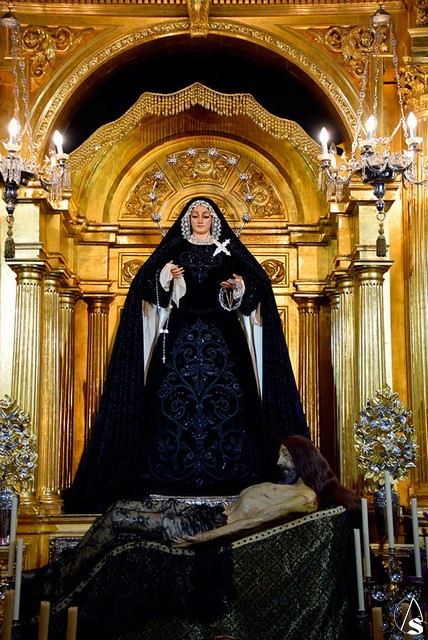 Antonio Rendón. Con motivo del mes de los difuntos, tal y como marca el calendario litúrgico la Santísima Virgen de los Dolores en su Soledad coronada de la ribereña localidad sevillana de Alcalá del Río, ha sido vestida con un atuendo de luto, para rezar y honrar en memoria del alma de todos sus hermanos y fieles difuntos. Y así permanecerá hasta que se celebre como es tradición, el último viernes de noviembre con santo rosario, misa y ejercicio de mes (este año el día 24).