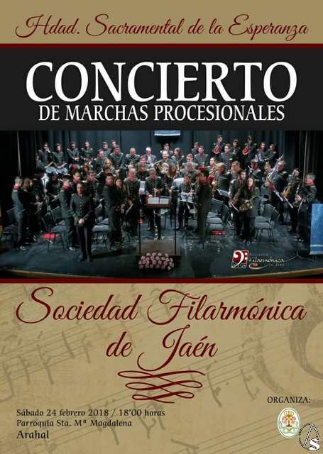 Arte Sacro. El próximo sábado 24 febrero a las 18:00 horas en la Parroquia Santa María Magdalena de Arahal, la Hermandad Sacramental de la Esperanza organiza su tradicional Concierto de Marchas Procesionales, intervendrá la Sociedad Filarmónica de Jaén.