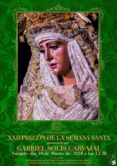 Arte Sacro. El Club Náutico Sevilla celebra este fin de semana la edición número 22 de su Pregón de la Semana Santa. El acto está programado el sábado 10 de marzo a partir de las 12,30 horas en sus salones sociales, con entrada libre al público y la presencia del experimentado cofrade hispalense Gabriel Solís Carvajal.