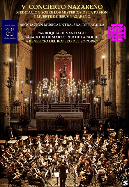 Arte Sacro. Hoy sábado, 10 de marzo a las 9 de la noche, organizado por la Hermandad Sacramental de Nuestro Padre Jesús Nazareno y María Santísima del Socorro, se celebrará en la Parroquia de Santiago el Mayor de Alcalá de Guadaíra el V Concierto Nazareno, con meditación sobre los misterios de la Pasión y Muerte de Jesús Nazareno.
