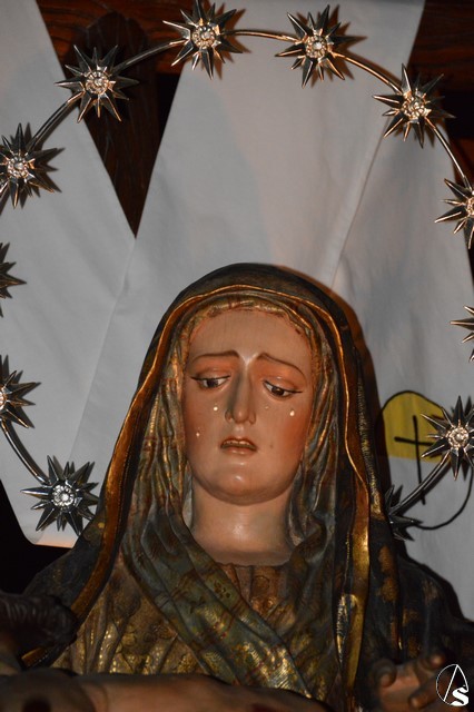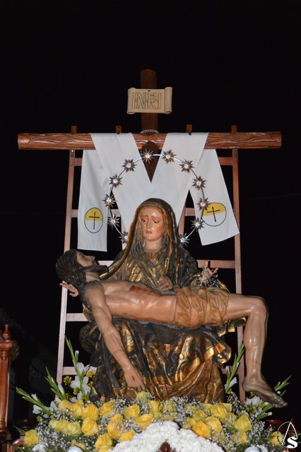 La bella imagen de Nuestra Señora de las Angustias, obra de José de Medina del siglo XVII, es portada a hombros de sus hermanos que luce el hábito nazareno.