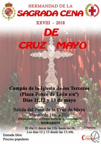 Arte Sacro. La Hermandad de la Sagrada Cena celebrará su anual Cruz de Mayo durante el fin de semana del 11 al 13 de mayo, en el compás de la iglesia de los Terceros, en horario el viernes desde las 21:00 hasta las 02:00 horas y el resto desde las 13:00 horas, hasta el cierre.