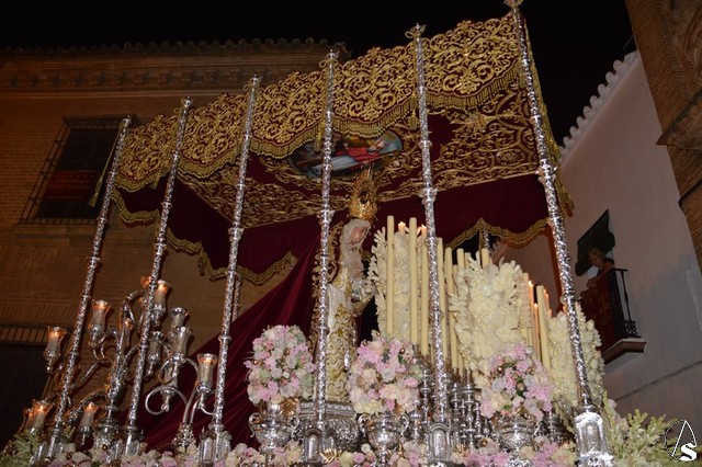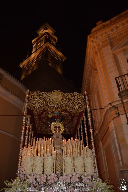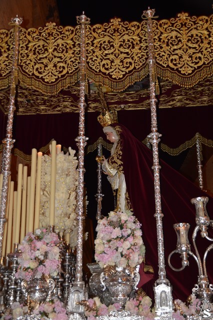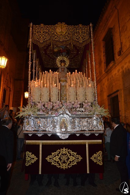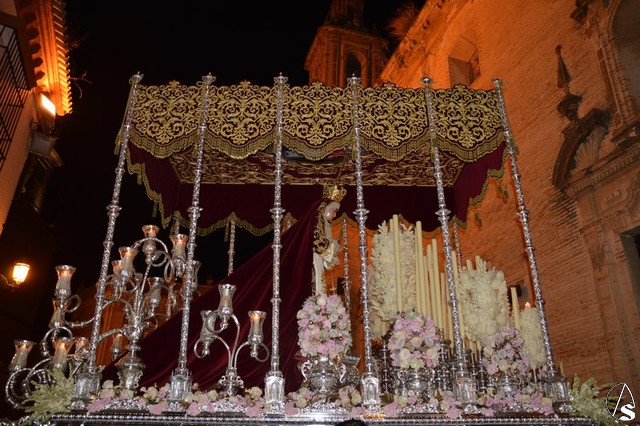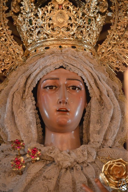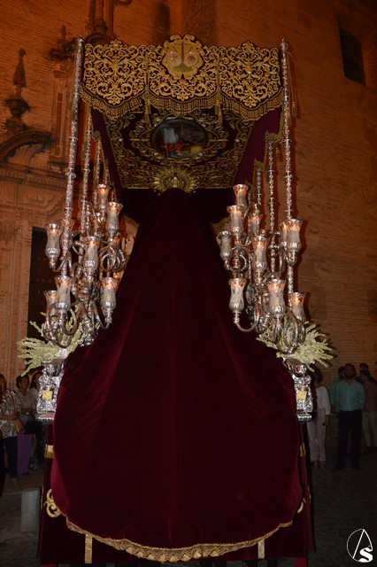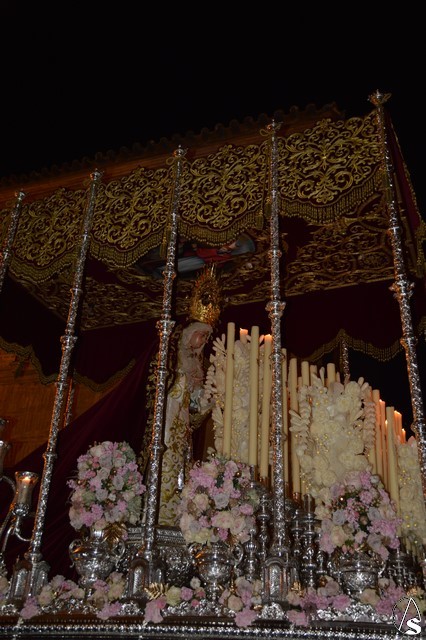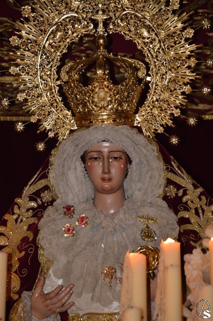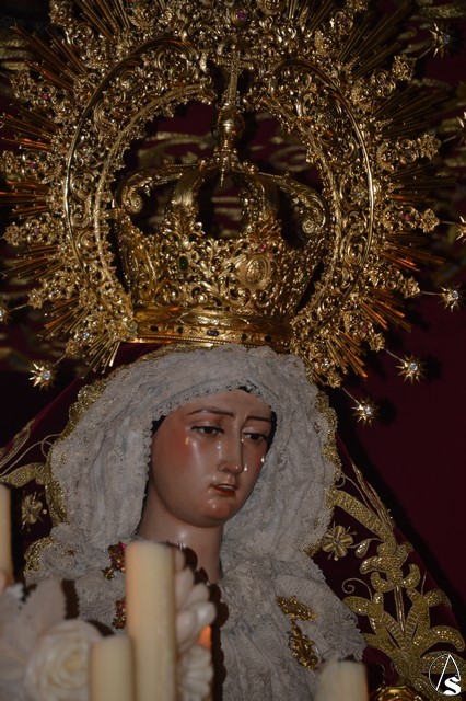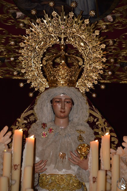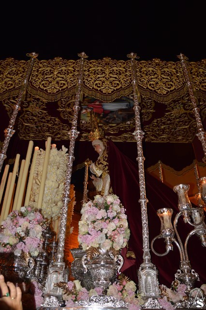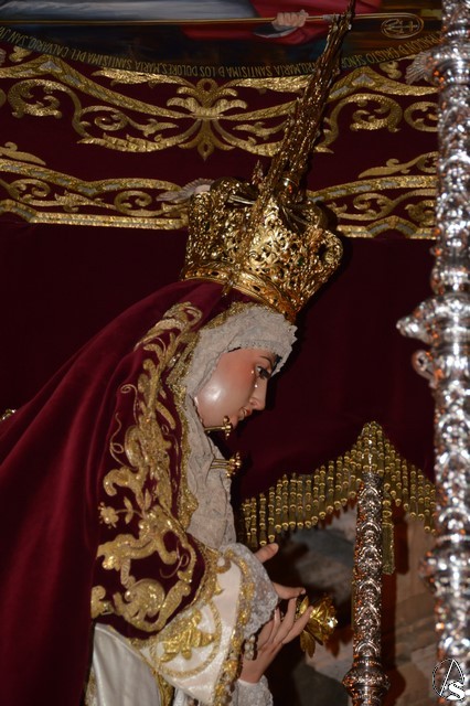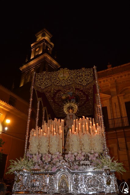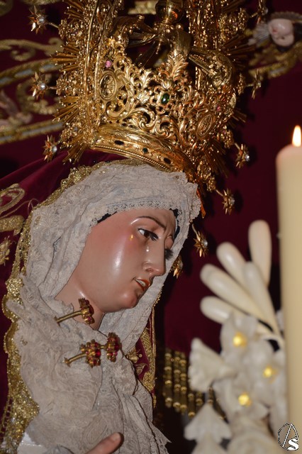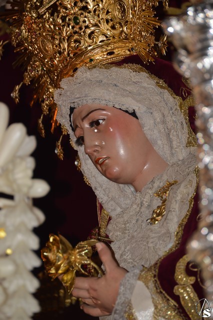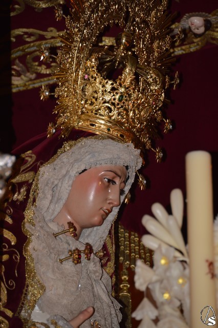 Ya la luna se había asomado a las bellas calles de la ciudad de Carmona para contemplar la salida de la Virgen de los Dolores desde Santa María arropada por todo un pueblo y tras un largo cortejo compuesto por todas las hermandades de la ciudad de Carmona y de distintas localidades. María Santísima de los Dolores, obra anónima del Siglo XVIII, procesionó bajo su bello palio de terciopelo grana bordado en oro. Gran variedad de flores exornaron el palio donde destacaban los tonos rosáceos y los nardos blancos de las esquinas. Para esta ocasión la Virgen lució saya blanca bordada y manto de terciopelo rojo teniendo bordadas las vistas delanteras. La pasada Semana Santa estrenaba la gloria del palio representando al titular de su sede canónica, San Blas Mártir, y en esta ocasión estrenaba los bordados del faldón delantero.