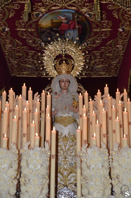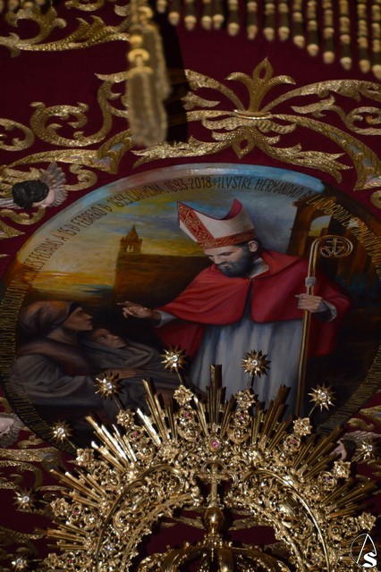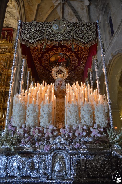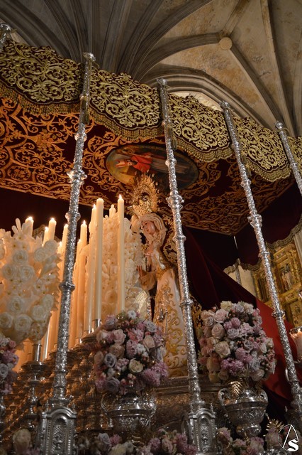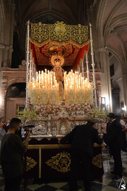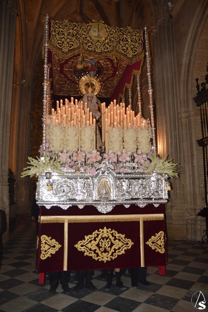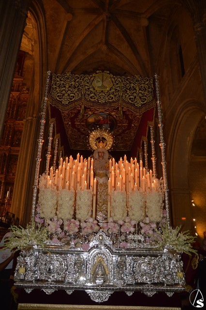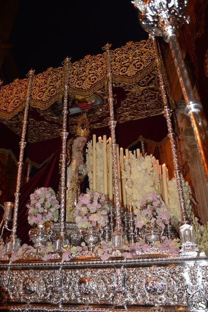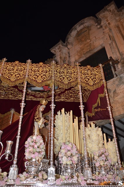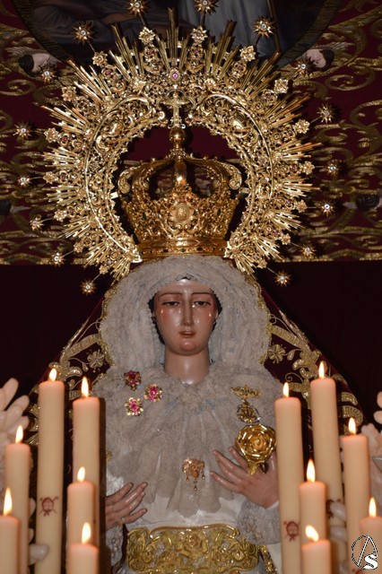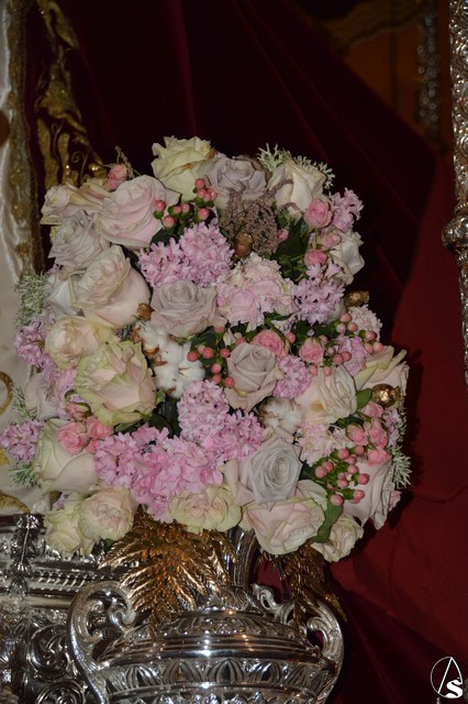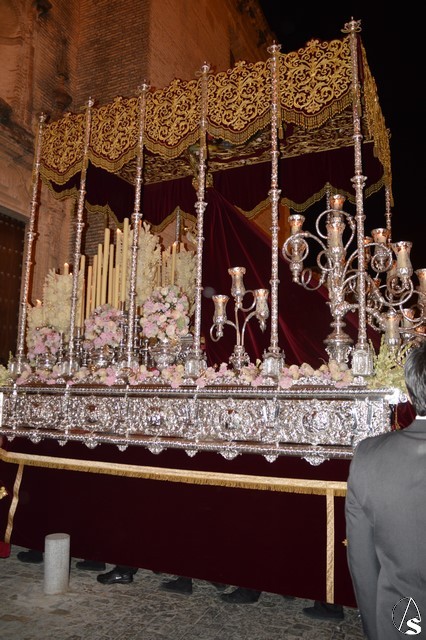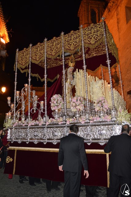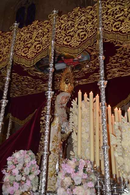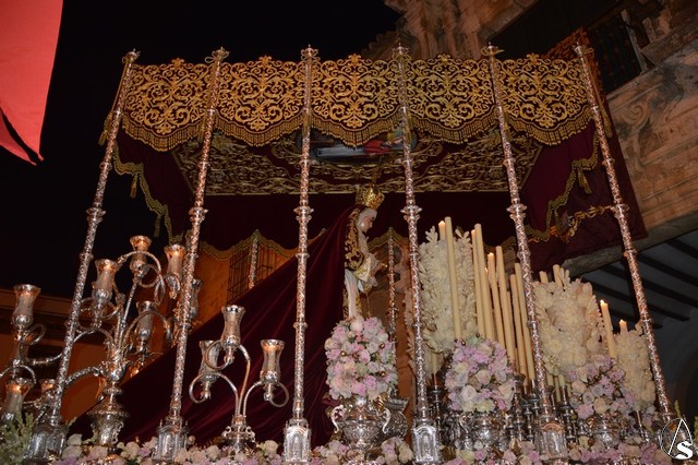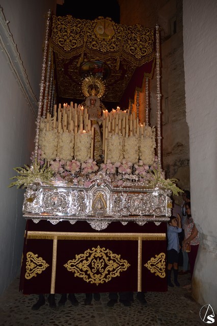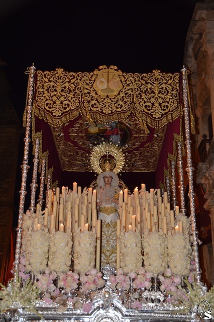 Ya la luna se había asomado a las bellas calles de la ciudad de Carmona para contemplar la salida de la Virgen de los Dolores desde Santa María arropada por todo un pueblo y tras un largo cortejo compuesto por todas las hermandades de la ciudad de Carmona y de distintas localidades. María Santísima de los Dolores, obra anónima del Siglo XVIII, procesionó bajo su bello palio de terciopelo grana bordado en oro. Gran variedad de flores exornaron el palio donde destacaban los tonos rosáceos y los nardos blancos de las esquinas. Para esta ocasión la Virgen lució saya blanca bordada y manto de terciopelo rojo teniendo bordadas las vistas delanteras. La pasada Semana Santa estrenaba la gloria del palio representando al titular de su sede canónica, San Blas Mártir, y en esta ocasión estrenaba los bordados del faldón delantero.