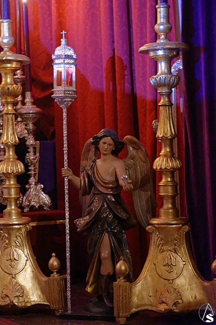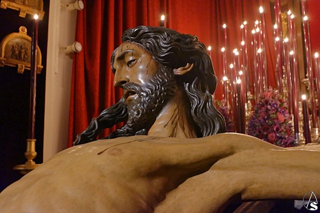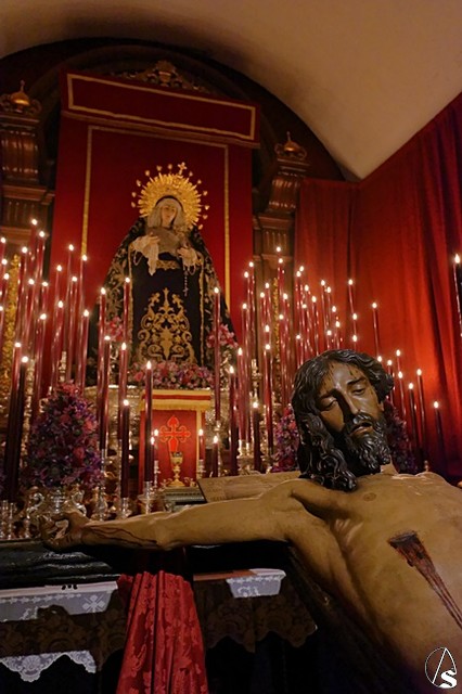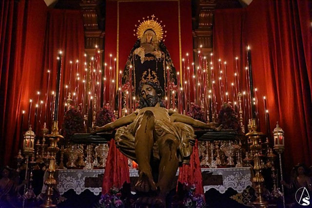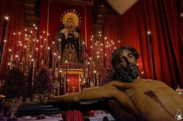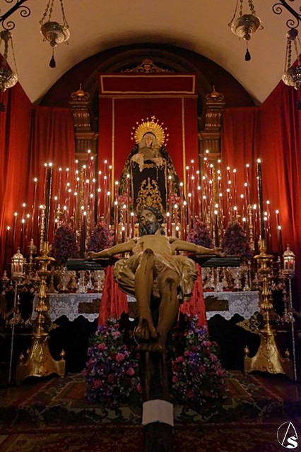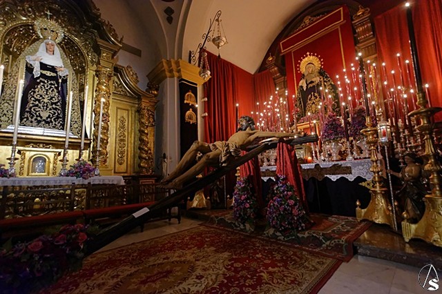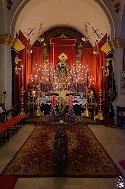En él podemos ver ángeles luminarios escoltando al Cristo, como los que acompañaron en la primera salida procesional al Santísimo Cristo en 1943, sobre su paso en solitario. Llos ángeles de aquella ocasión eran de la Hdad de la Esperanza de Triana y se encuentran en Santa Ana, estos han sido cedidos por la hermandad de la Vera Cruz. Los candeleros que se encuentran ante la Virgen del Mayor Dolor han sido cedidos por la hermandad de la Redención. 4 blandones dorados de la Hermandad de La Redención, que ya aparecen en una foto de los primeros besapies del Santísimo Cristo en la iglesia de Santiago. En el altar se encuentran un manifestador donde se sitúa la Cruz de Santiago (cedido por la Hermandad del Amor) y el Cáliz (simbología del Cristo de Las Aguas) que porta el ángel el Lunes Santo. El exorno floral está formado por erigium, lirios, rosas, clavel, clavellina y alstroemerias de la Floristeria Antonio Mendoza Arte Flora.