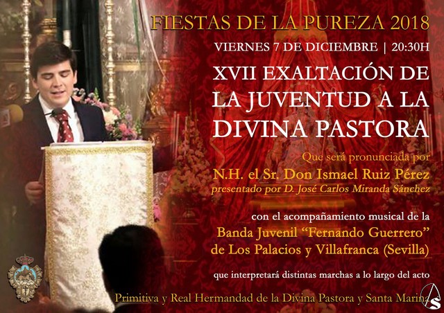 El viernes día 7, a partir de las 20,30 horas en la capilla de la calle Amparo, tendrá lugar la XVII Exaltación de la juventud a la Divina Pastora, la cual será pronunciada por el hermano Ismael Ruiz Pérez, que será presentado por José Carlos Miranda Sánchez, exaltador de la pasada edición. Acompañará musicalmente la Banda juvenil Fernando Guerrero de la localidad de Los Palacios y Villafranca. Al término de la misma, quedaría abierto el solemne besamanos a la Madre, la Divina Pastora de Nuestras Almas, y tomaran una copa en el salón de actos de la casa de hermandad, que preparará el grupo joven. Quedan invitados a este singular evento donde podran disfrutar de un ambiente fraterno en la corporación.