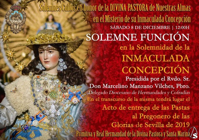 - Función en la Solemnidad de la Inmaculada y XXIII Acto de entrega de las Pastas al Pregonero de las Glorias de Sevilla: Sábado 8 de diciembre, a las 12 horas.