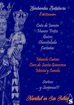 A partir de las 13,30 horas en la Plaza de San Julián, celebraran la III Zambomba solidaria con la participación de Manolo Cuevas, Coro de Santa Genoveva, y el grupo “Menta y Canela” que cantarán villancicos populares. Tendran degustación de jamón, huevos fritos, guisos y un ambigú con precios populares, chocolate y castañas.