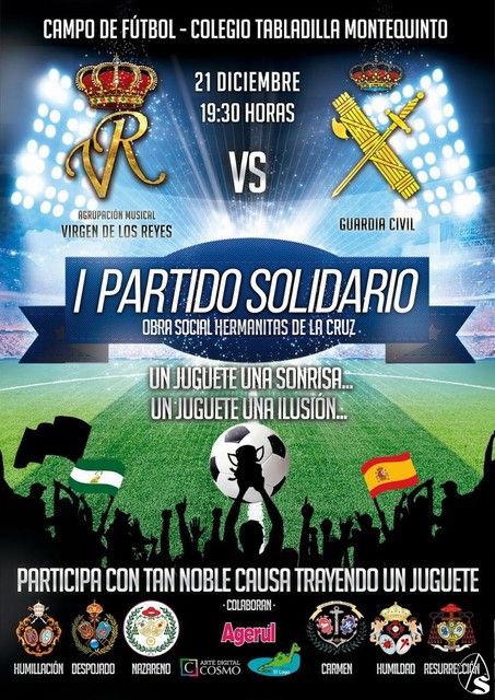 Ese día en el campo de fútbol del Colegio Tabladilla, ubicado en MonteQuinto (Dos Hermanas, Sevilla), va a tener lugar el I Partido Solidario organizado por la Agrupación Musical Virgen de los Reyes y que se enfrentará a un equipo formado por agentes de la Guardia Civil.