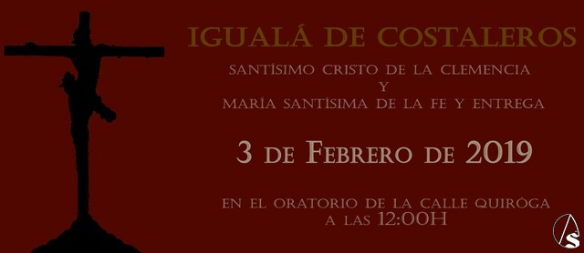 Arte Sacro. El 3 de febrero a las 12h, en el oratorio de la Calle Quiroga, 3 de Sevilla, tendrá lugar la igualá de costaleros del Cristo de la Clemencia y Maria Santísima de La Fe y Entrega. Se ruega llevar calzado negro de salida.