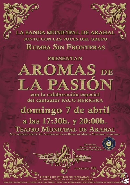 Arte Sacro. El domingo 7 de abril el Teatro Municipal de Arahal acoge el espectáculo cofrade 'Aromas de la Pasión' a cargo de la Banda de Música Municipal de Arahal y junto a los voces del grupo Rumbas Sin Fronteras.
