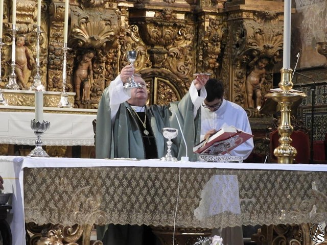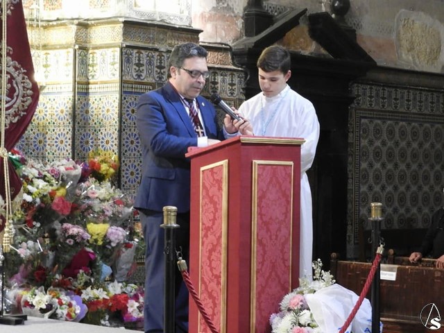 Comenzaba el acto con una ofrenda floral por parte de la Hermandad de la Sed y unas palabras de emotivas y de agradecimiento del hermano mayor, José Cataluña. Seguidamente, comenzaba la santa misa, que estuvo oficiada por Joaquín Reina Sousa, párroco de Santa María de la Mesa y Rector del Santuario de Consolación, y en la que intervino el Coro Sacro Madre de la Iglesia.