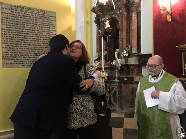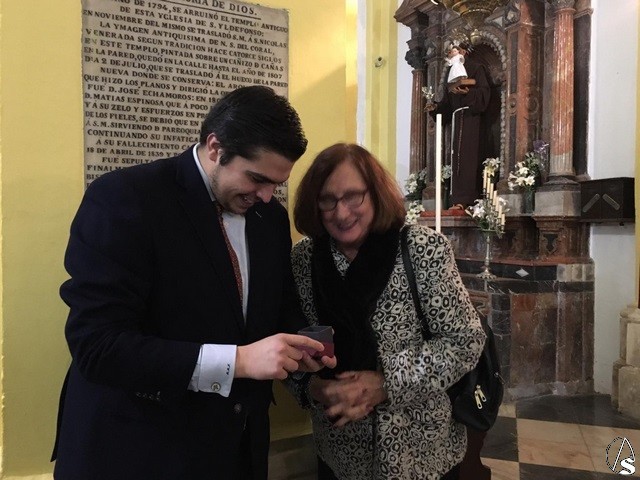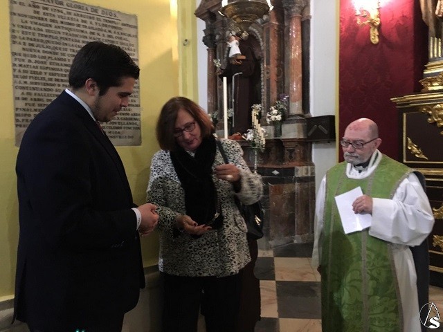 Es intención de la Junta de Gobierno de la Hermandad obsequiar a partir de este año, al pregonero de Glorias con este presente tan representativo del carácter de esta Corporación. En las fotos podemos ver a la Hermana Mayor, María del Pilar Torras, entregarle los presentes al Pregonero, acto al que asistió la Delegada de Glorias, Milagros Ciudad.