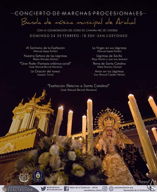 Arte Sacro. El domingo 24 de febrero, tendrá lugar en la parroquia de San Ildefonso un concierto a cargo de la Banda de música municipal de Arahal. En el mismo, se presentará el estreno de una nueva marcha dedicada al regreso de la corporación de la Exaltación a la iglesia de Santa Catalina después de 14 años.