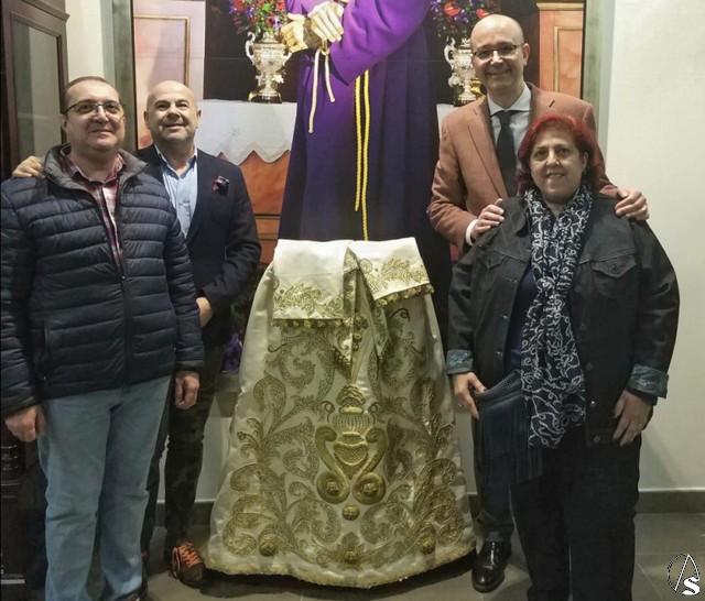 La hermosa pieza ha sido restaurada y pasada en los últimos meses por los hermanos Juan Francisco Suárez Martín, Francisca Rosado Trigueros y Francisco Carrera Iglesias, donando este último los materiales necesarios para dicha labor y recuperándose el dibujo original de esta bella obra que fue así una de las primeras sayas confeccionadas para el ajuar de la sagrada titular. En la imagen, los hermanos que lo han hecho posible junto al hermano mayor, en una fotografía tomada en la casa de hermandad en días pasados.