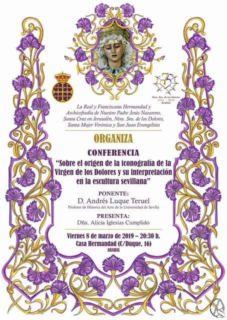 Arte Sacro. Hoy viernes, 8 de marzo a las 20:30 horas en la Casa Hermandad de Jesús Nazareno de Arahal, tendrá lugar la segunda conferencia con motivo del 75 Aniversario de la imagen de Nuestra Señora de los Dolores. Ésta será impartida por Andrés Luque Teruel, Profesor de Historia del Arte de la Universidad de Sevilla, 'Sobre el origen de la iconografía de la Virgen de los Dolores y su interpretación en la escultura sevillana'. La presentación correrá a cargo de Alicia Iglesias Cumplido.