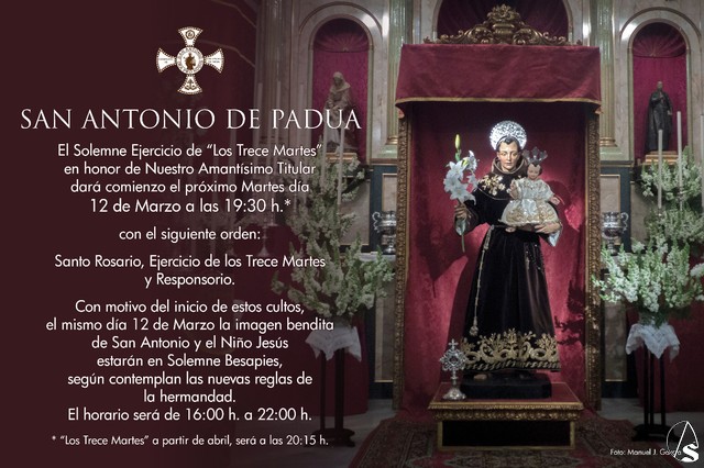 Arte Sacro. Hoy martes día 12 de Marzo a las 19:30 horas en la Hermandad de San Antonio de Padua de Arahal comenzará el Solemne Ejercicio de los Trece Martes, con motivo del inicio de estos cultos la Imagen Bendita de San Antonio y el Niño Jesús estarán en Solemne Besapies desde las 16:00 horas a las 22:00 horas.