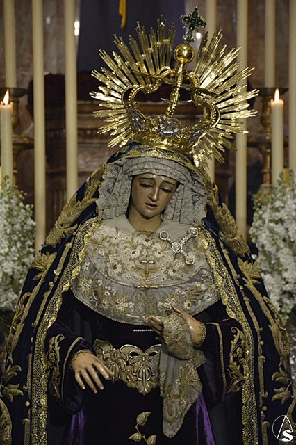 Estrellas de cristal que, en su mirada, recorren su rostro y en su pañuelo son océanos de amor. Encaje que la alumbra y endulza su pena, entre suspiros de fervor. Nada rompe el silencio, ni siquiera el llanto.