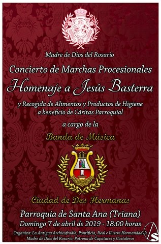 Arte Sacro. El domingo 7 de abril, a las 18:00 horas, tendrá lugar en la parroquia de Santa Ana un concierto de marchas procesionales como homenaje a Jesús Basterra y recogida de alimentos y productos de higiene a beneficio de cáritas parroquial. El concierto correrá a cargo de la banda de música Ciudad de Dos Hermanas y esta organizado por la Hermandad de Madre de Dios del Rosario.