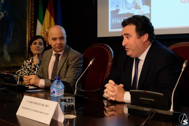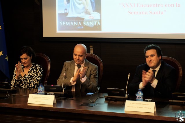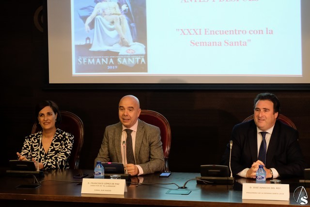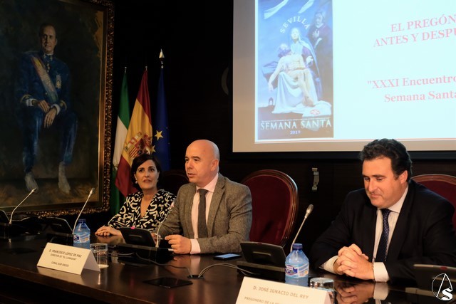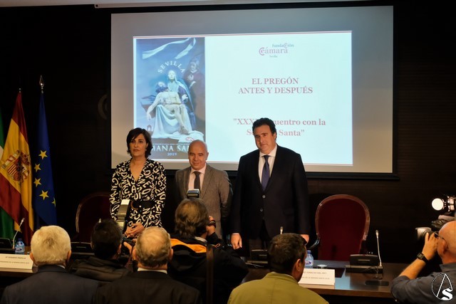Daniel García Acevedo. El salón de actos de la Cámara de Comercio, sita en la Plaza de la Contratación, acogió ayer lunes, 1 de abril, el XXXII encuentro de la Semana Santa, el pregón antes y después, en el que intervienen todos los años el pregonero de la Semana Santa del año anterior y el actual, en este caso los de 2018 y 2019, a la sazón, José Ignacio del Rey Tirado y Rosario Padilla Hoyuela, más conocida como Charo Padilla.