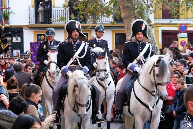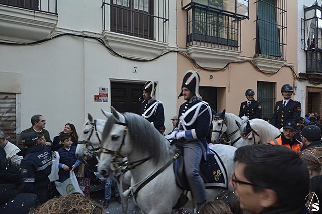 El Heraldo Real iba escoltado por policías reales de vestimenta clásica, a caballo. Cerrando el cortejo iba la agrupación musical Ntra. Sra. de la Victoria de Arahal.