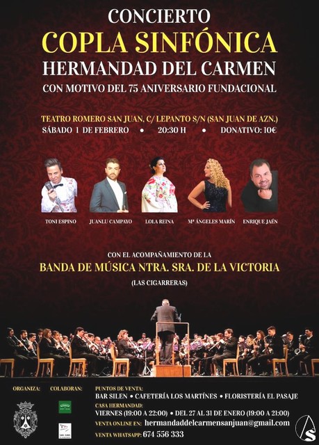 Arte Sacro. La Hermandad del Carmen de San Juan de Aznalfarache organiza para el próximo 1 de febrero a las 20,30 horas un Concierto Benéfico de Copla Sinfónica.