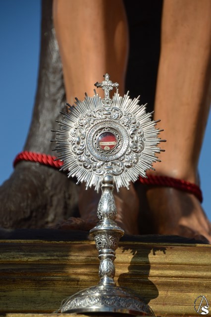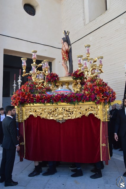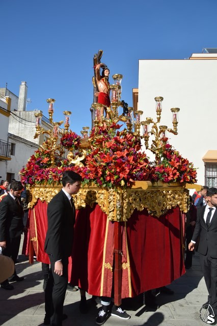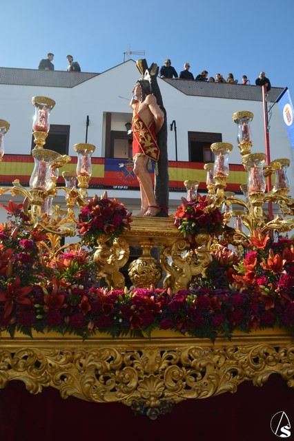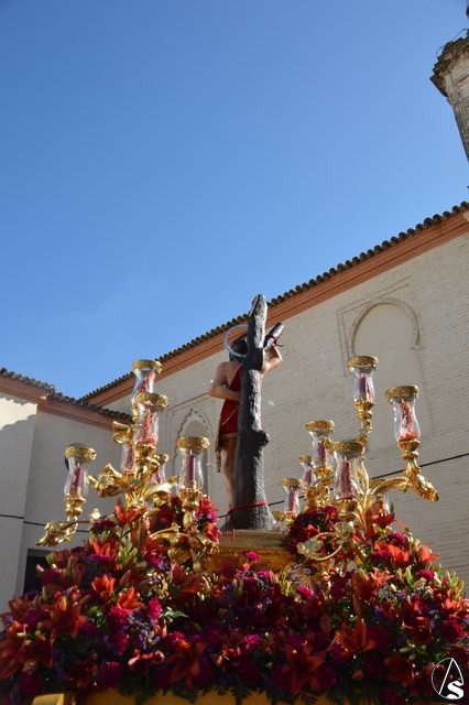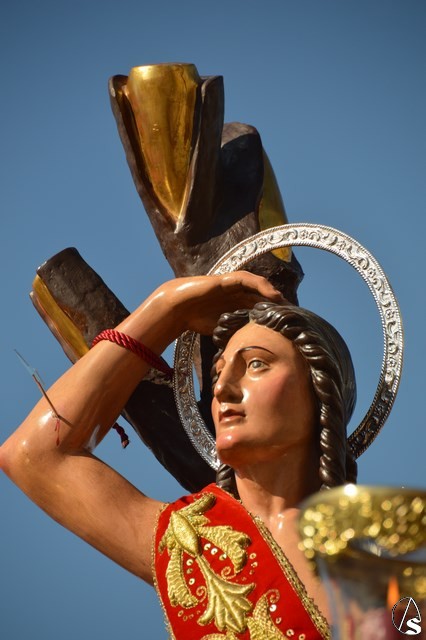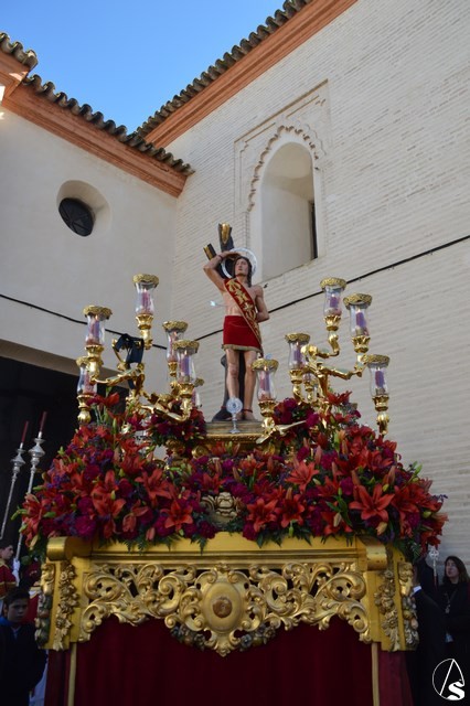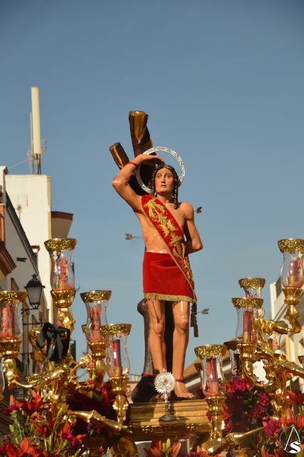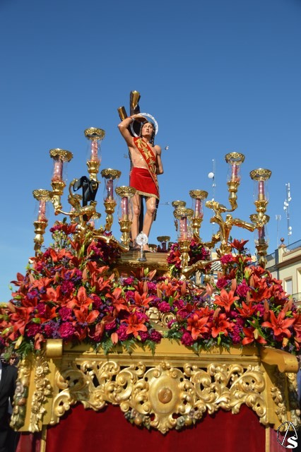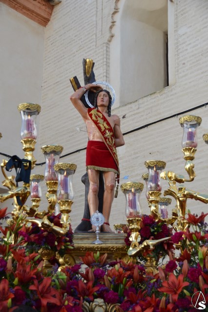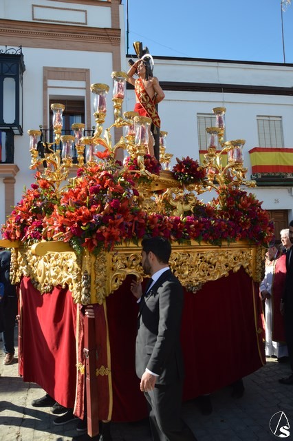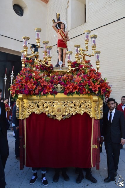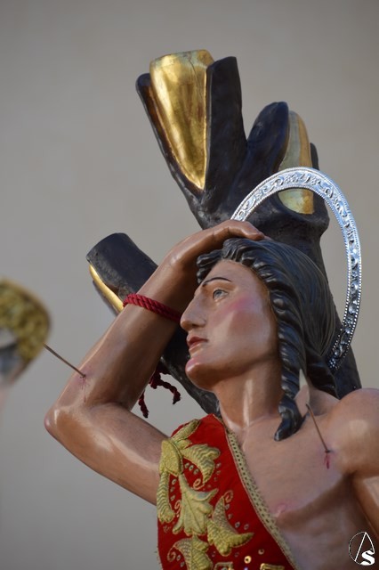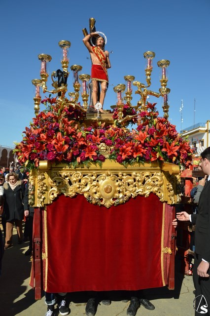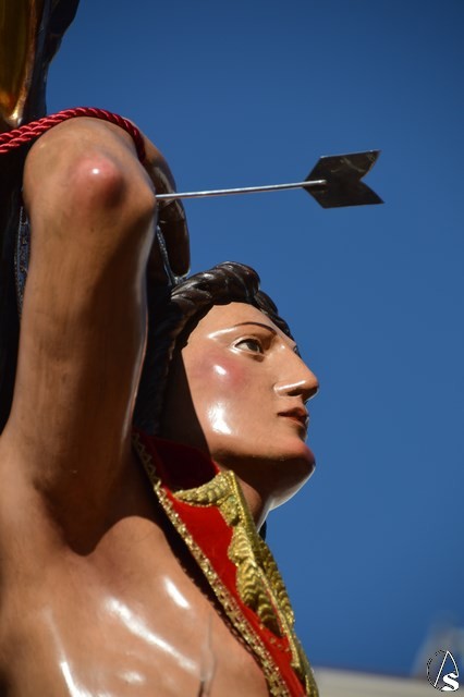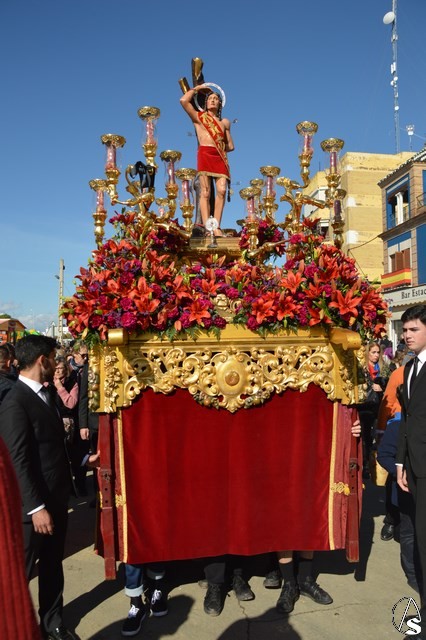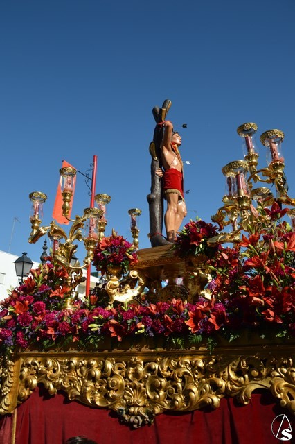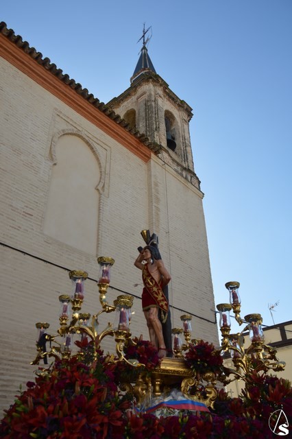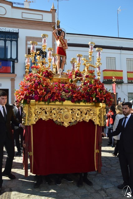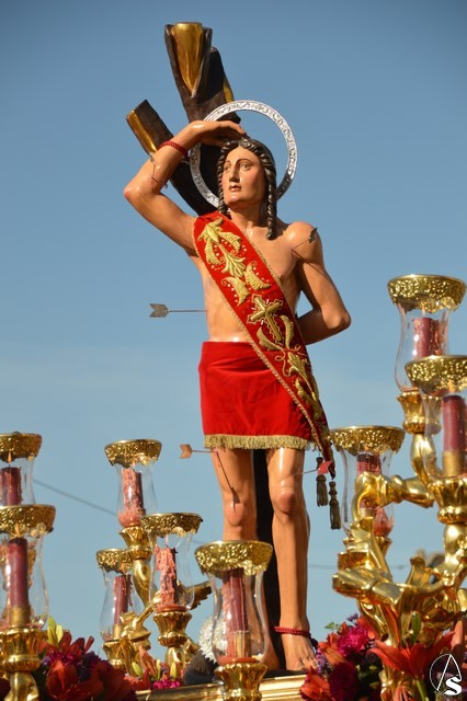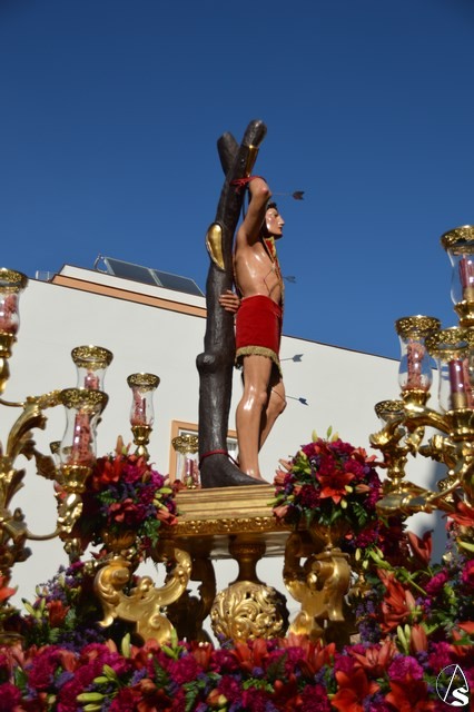 La imagen de San Sebastián es una talla anónima del siglo XVI. Procesiona sobre paso de madera dorada, estando alumbrada por candelabros de guardabrisas en las esquinas. El paso estuvo exornado con una variedad de flores de tonalidades rojas. A los pies del Mártir pudimos contemplar una pequeña reliquia. La Banda Municipal de La Puebla del Río acompañó musicalmente al Patrón de todos los cigarreros.