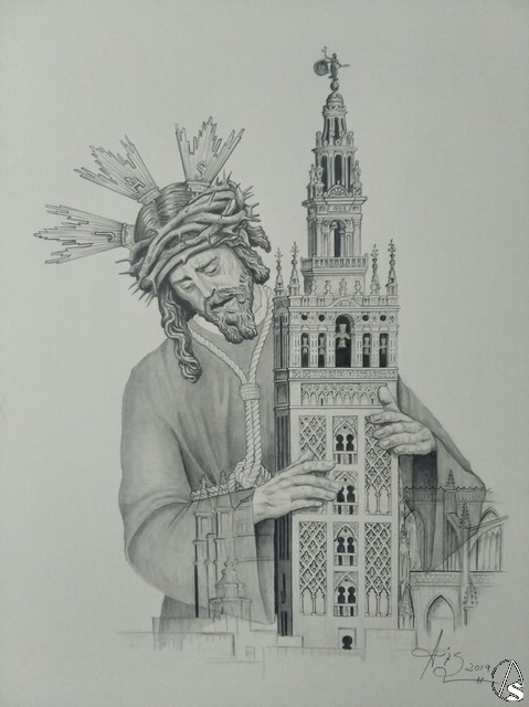 Usando grafito sobre papel canson crema de 50x65 cm, el artista ha querido simbolizar la protección del señor sobre Sevilla y sus habitantes. Uniendo dos obras de arte asociadas intrínsecamente a la esencia de nuestra ciudad, la universal Giralda y Jesús del Gran Poder, una de las mayores devociones no solo de nuestra ciudad, sino también de España y gran parte de iberoamérica.