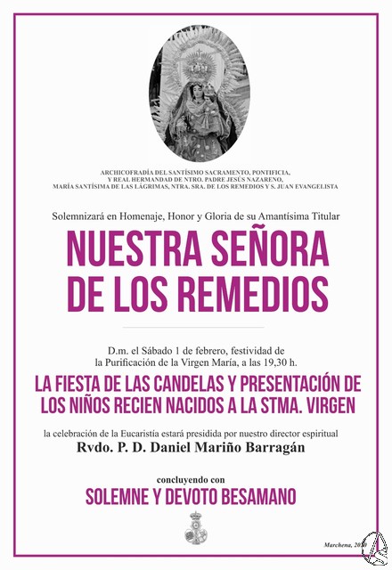 Arte Sacro. Mañana sábado día 1 de febrero, y siguiendo la tradición de la Santa Iglesia, la Hermandad de Jesús Nazareno de Marchena celebrará en la Parroquia de San Miguel el día de la Candelaria, día en el que se conmemora la festividad litúrgica de la presentación del Niño Jesús en el templo.