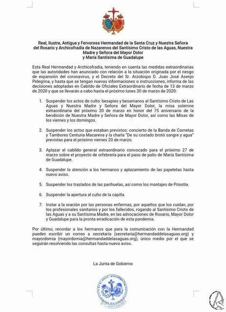 Esta Real Hermandad y Archicofradía, teniendo en cuenta las medidas extraordinarias que las autoridades han anunciado con relación a la situación originada por el riesgo de expansión del coronavirus, y el Decreto del Sr. Arzobispo D. Juan José Asenjo Pelegrina, y hasta que se tengan nuevas informaciones o instrucciones, informa de las decisiones adoptadas en Cabildo de Oficiales Extraordinario de fecha de 13 de marzo de 2020 y que se llevarán a cabo hasta el próximo lunes 30 de marzo de 2020:
