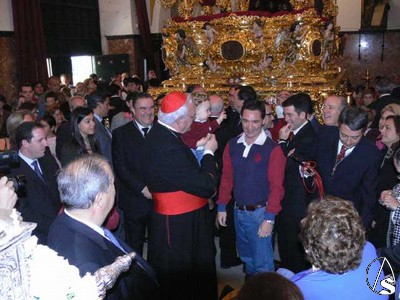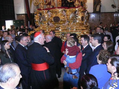 Daniel García Acevedo. En nuestra visita matinal hemos coincidido en varias hermandades con el Cardenal de Sevilla. Concretamente en la hermandad de Montserrat, después de su corto sermón, se acercó a un niño y haciéndo gala de su amabilidad y simpatía le dijo: "Este niño es el que ha estado más pendiente de de todo lo que he dicho". Por lo que todos los presentes sonreimos. Entonces tomó al niño en sus brazos y estuvo departiendo con él unos instantes. Por eso nuestro titular dice lo que Él hace: Dejad que los niños se acerquen a mi, si no, me acerco yo a ellos.