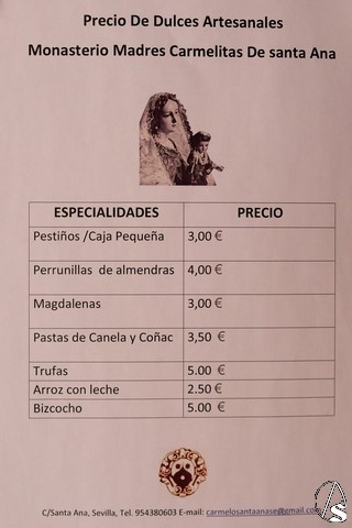 Arte Sacro. Las hermanas carmelitas calzadas del convento de Santa Ana piden la colaboración para ayudarlas a su sostenimiento en el difícil momento por el que están pasando con motivo de esta terrible pandemia que estamos padeciendo, a través de la adquisición de las elaboraciones de los dulces que ellas mismas preparan, siendo esta la única fuente de ingresos de la que disponen: yemas, pestiños, trufas, pastas alemanas, empanadillas, panellets, cordiales de totana y suspiros de almendras.