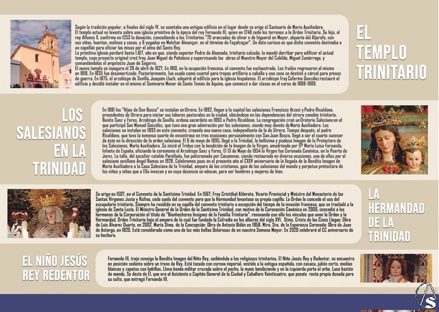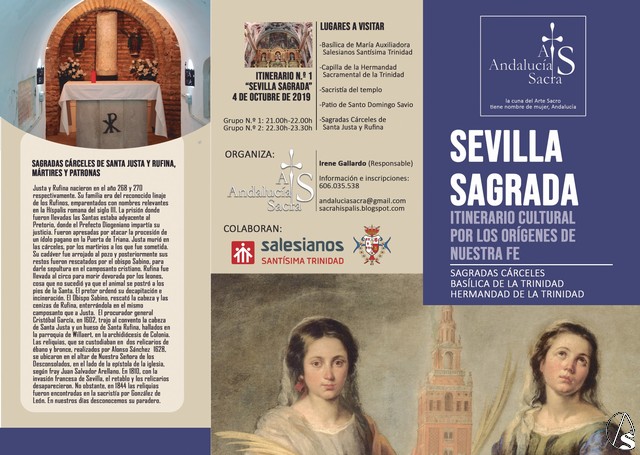 Andalucía Sacra, ha creado una serie de itinerarios en relación del origen de nuestra fe, que se desarrollarán durante el ejercicio 2019/2020, en la Trinidad, con motivo de la conmemoración del CXXV aniversario de la llegada de la Bendita Imagen de María Auxiliadora, a la Casa Salesiana de la Trinidad, y del CC aniversario de la hechura por el maestro imaginero Juan de Astorga, de la Bendita Imagen de Nuestra Señora de la Esperanza de la Trinidad.