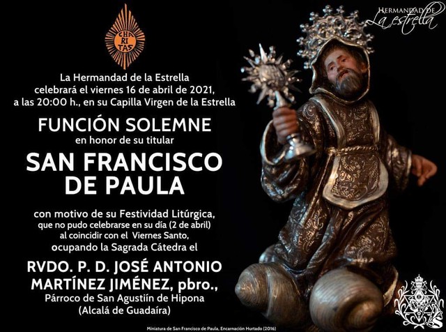 Arte Sacro. El viernes 16 de abril, a las 20 horas, la hermandad de la Estrella celebrará la solemne función en honor de San Francisco de Paula, con motivo de su festividad. La Iglesia celebra el día del titular en la jornada del 2 de abril, pero en el presente año, dada la coincidencia con el Viernes Santo, la hermandad, tal y como preceptúan sus Reglas, ha tenido que modificar la fecha de la misma.
