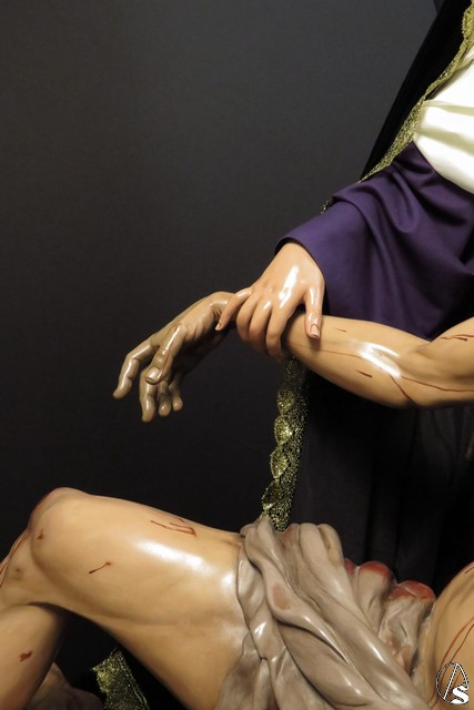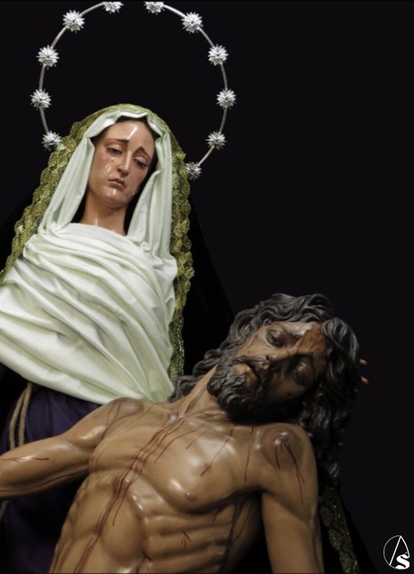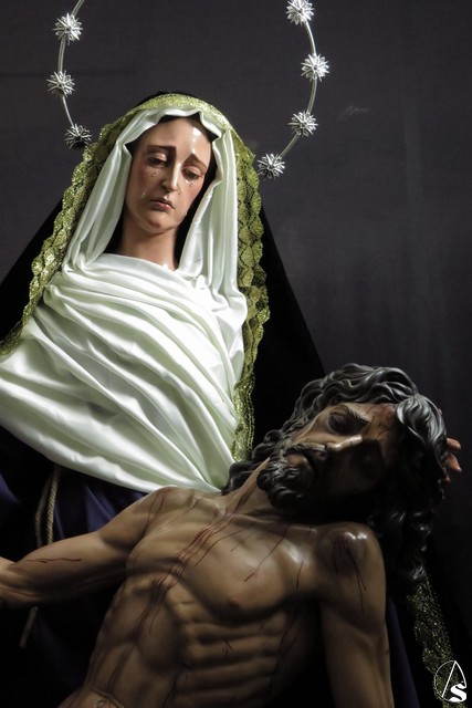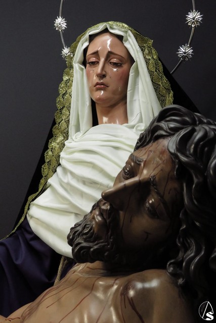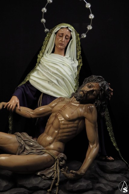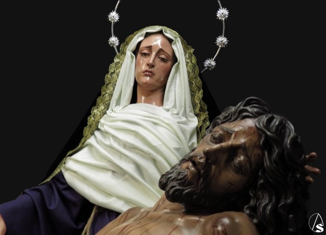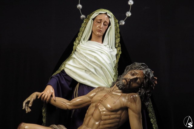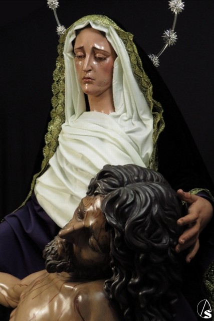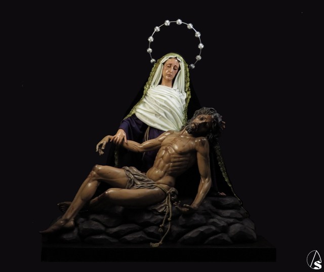 Arte Sacro. Nueva obra escultórica de Adrián Lema Gómez, de bulto redondo combinada en talla completa y de vestir. Representa el momento en que la Virgen María recibe el cuerpo de Jesús y lo sostiene en sus brazos, justo antes de la llamada lamentación sobre Cristo muerto.