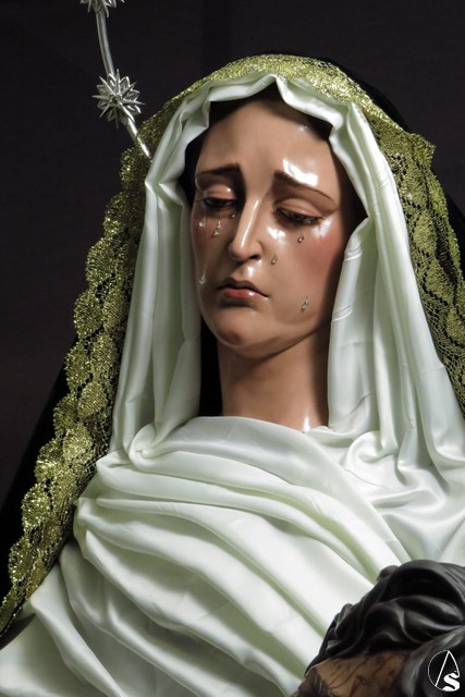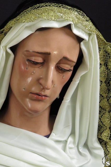 La expresión de la dolorosa es dulce pero apenada. Las cejas se apaciguan para conferir mayor dulzura y realismo a sus ojos grandes de largas pestañas y llorosos. La dirección de su cabeza, contornada hacia abajo, nos hace pensar que María contempla y medita la escena en su corazón.