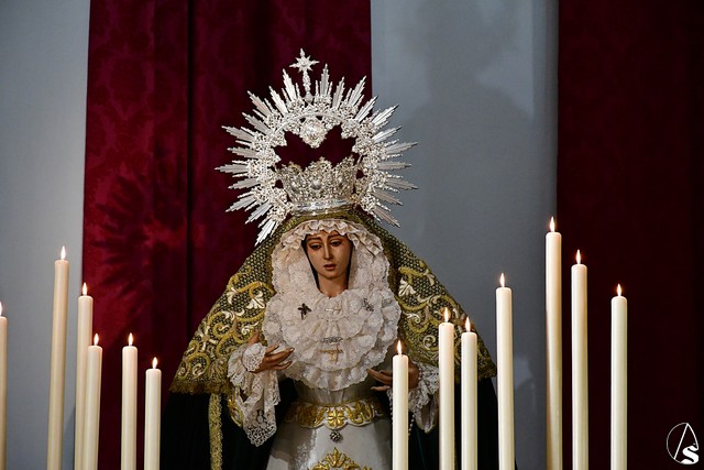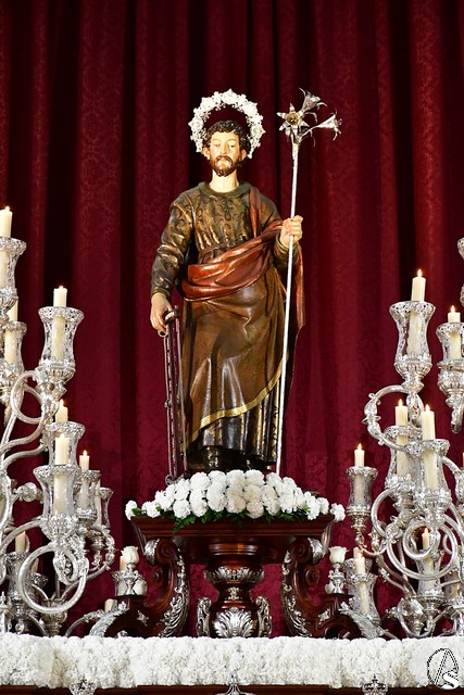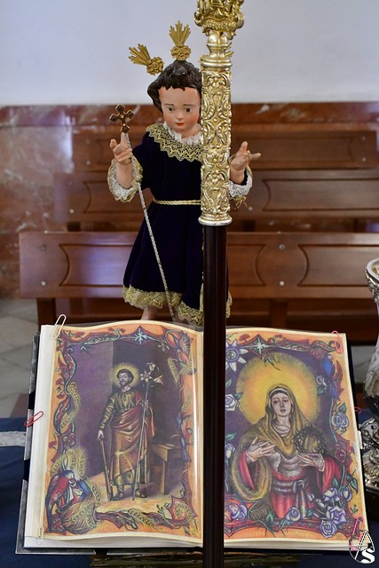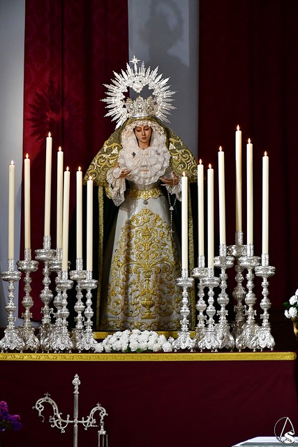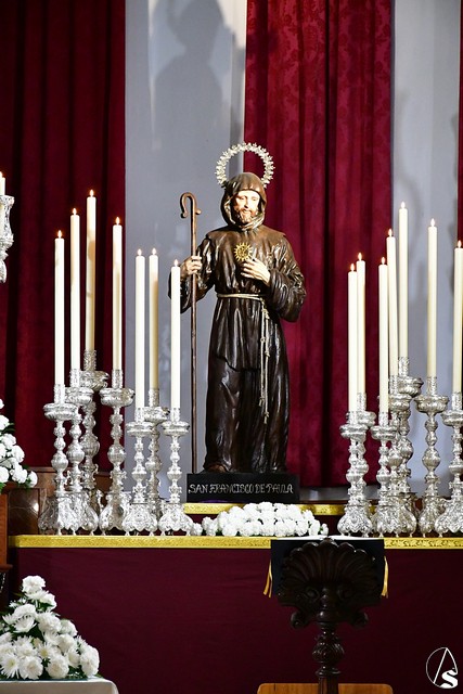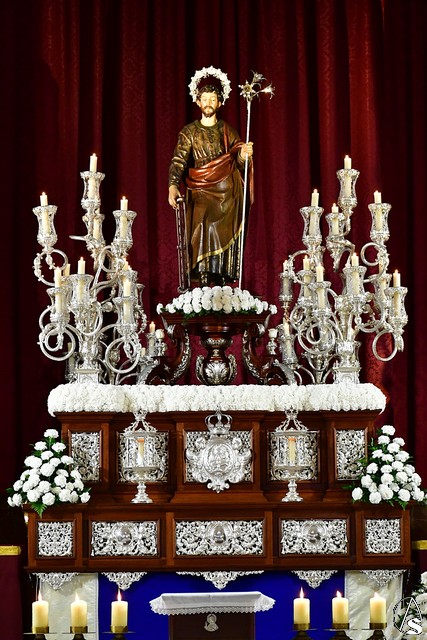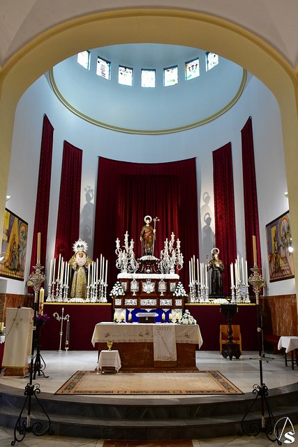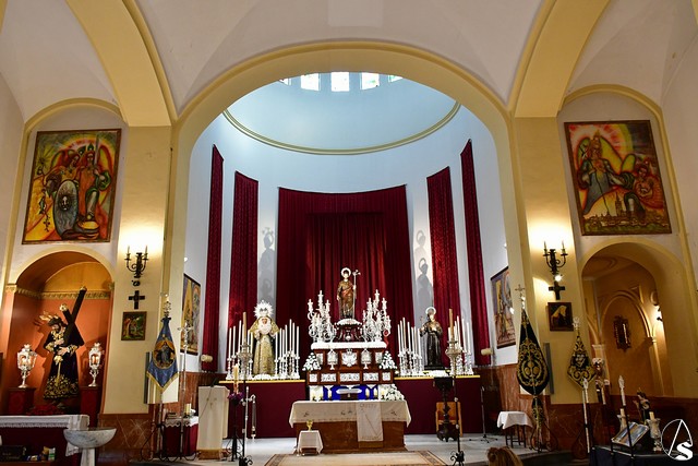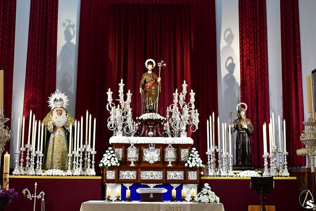 Arte Sacro. La imagen de San José Obrero preside los cultos desde su paso procesional bajo la cúpula de la Parroquia, en un altar instalado por la priostía de la Hermandad con Nuestra Señora de los Dolores y San Francisco de Paula a su lado.
