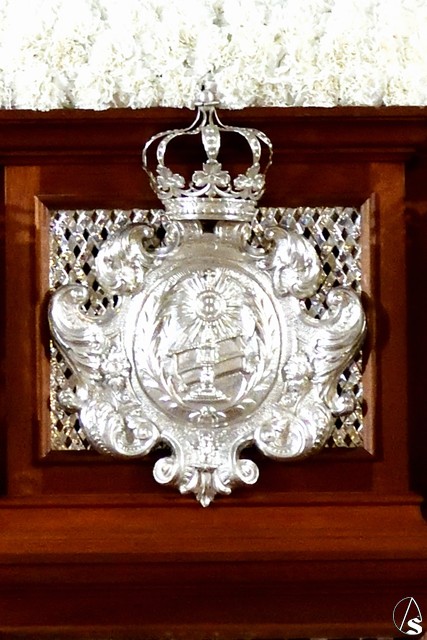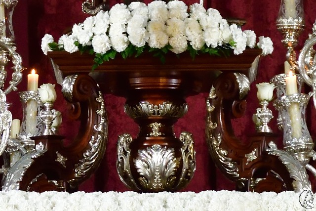 En el frente de la canastilla, superpuesto a mayor resalte, va el escudo corporativo, y por debajo de los respiraderos, una ligera guarnición o cenefa, igualmente de metal plateado. En la repisa de la parihuela se sitúan una docena de guardabrisas, dos en cada frente, cuatro en los lados. A lados de la preciosa peana, se colocan dos jarras de orfebrería. Si nos fijamos bien, observaremos que la misma peana dispone (en sus cuatro arbotantes) de unas diminutas anforillas, válidas para un solo clavel, un capullo de rosa o cualquier otra flor por el estilo. Faldones azules, con franjas verticales blancas en los extremos de cada pieza, confeccionados en 2010 por el taller de Mariano Martín Santonja.