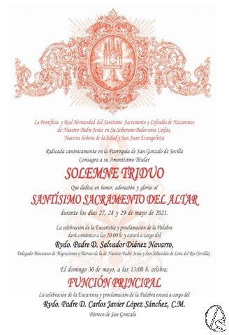 Arte Sacro. La hermandad de San Gonzalo celebra durante los días 27 al 29 de mayo solemne triduo al Santísimo Sacramento del altar, dando comienzo a las 20:00 horas, con proclamación de la palabra a cargo de Salvador Diánez Navarro, delegado diocesano de Migraciones y párroco de la de Nuestro Padre Jesús y San Sebastián de Lora del Rio (Sevilla).