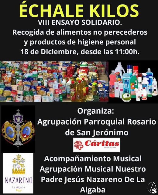 Arte Sacro. El sábado, 18 de diciembre, a las 11 horas, dará comienzo el VIII ensayo solidario que organiza la Agrupación parroquial del Rosario por las calles del barrio de San Jerónimo para la recogida de alimentos no perecederos y productos de higiene personal. Se ruega, en la medida de lo posible, que todo aquel que pueda entregue productos de higiene personal debido a la escasez de estos en la diputación de caridad.