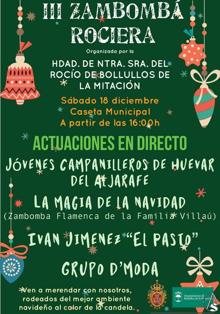El artista local Iván Jiménez ‘’Pasto’’, el grupo Jóvenes Campanilleros de Huevar del Aljarafe, la Zambomba Flamenca de la Familia Villau ‘‘La Magia de la Navidad’’, y el Grupo D’Moda de la localidad Aljarafeña de Huevar del Aljarafe completan el cartel de actuaciones de esta tercera edición de la Zambomba Rociera organizada por la Hermandad de Ntra. Sra. del Rocío de Bollullos de la Mitación, en colaboración con el Ayuntamiento de la localidad.