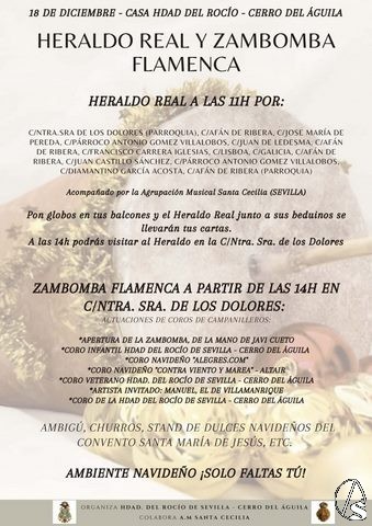 Arte Sacro. La hermandad de Ntra. Sra. del Rocío de Sevilla – Cerro del Águila, organiza una jornada festiva el sábado 18 de diciembre, con la salida por las calles del barrio del Heraldo Real y la posterior zambomba flamenca, a las puertas de la casa de hermandad.