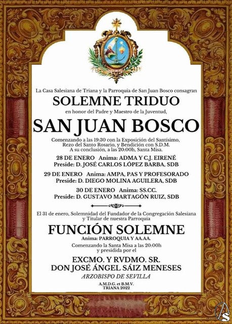 El solemne triduo estará presidido por tres salesianos de la Comunidad Salesiana, mientras que la solemne función la presidirá José Ángel Sáiz Meneses, Arzobispo de Sevilla, en la que será su primera visita a esta Comunidad Educativo-Pastoral.