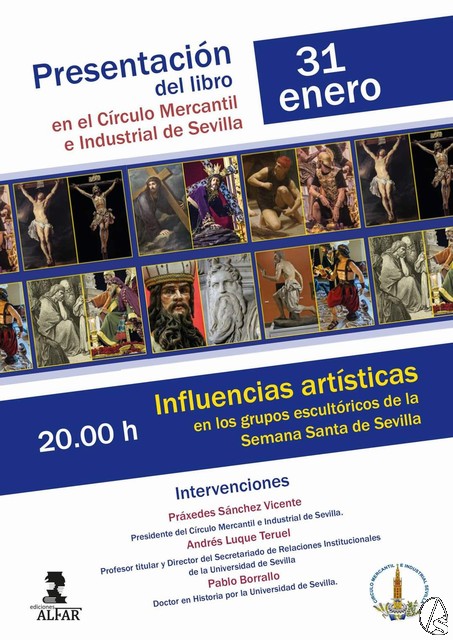 Arte Sacro. El lunes 31 de enero en el patio del Círculo Mercantil e Industrial de Sevilla (calle Sierpes, 69), a las 20 horas tendrá lugar la presentación del libro: "Influencias artísticas en los grupos escultóricos de la Semana Santa de Sevilla".