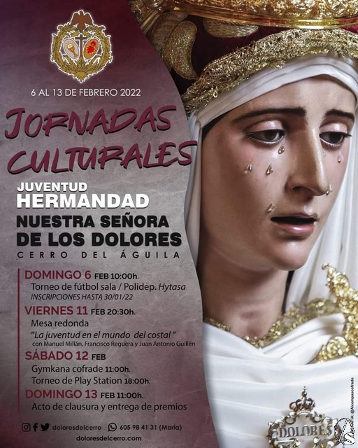 Arte Sacro. La juventud de la hermandad de Nuestra Señora de los Dolores del Cerro del Águila tiene el placer de anunciar sus I Jornadas Culturales, que se desarrollarán del 6 al 13 de febrero. Para ello, la juventud ha organizado una serie de actos a realizar que desglosaremos a continuación: